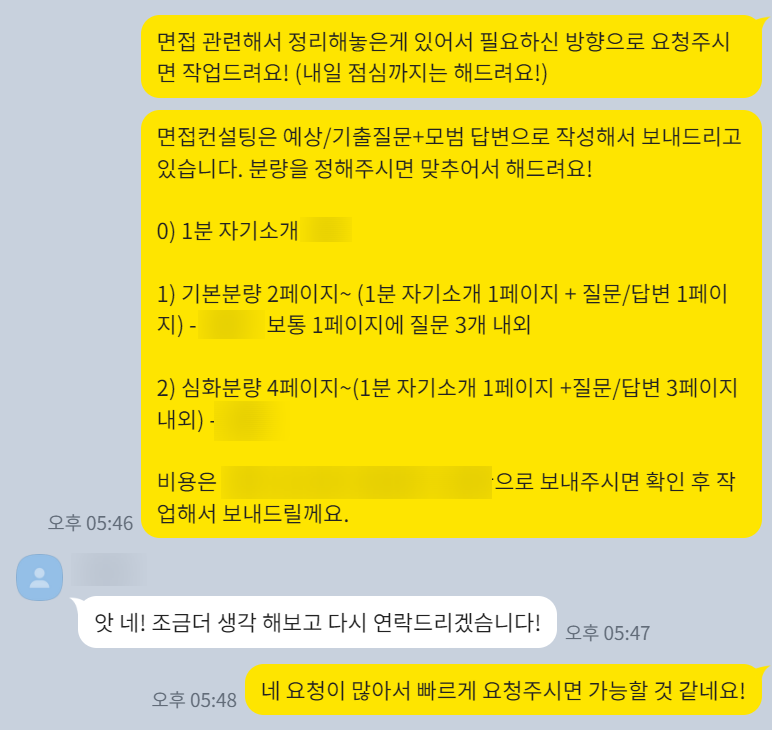 저는 자기소개서 첨삭, 대필, 작성 대행 서비스를 제공하고 있습니다. 지원자님의 상황과 목표에 맞춰 최적의 솔루션을 제공해 드립니다.