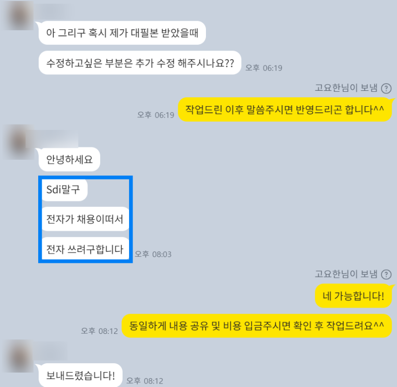저의 **자기소개서 첨삭 및 대행 서비스**는 언제나 지원자분과의 **긴밀한 소통**을 바탕으로 진행된답니다. 이번 삼성전자 지원자분과의 과정도 마찬가지였어요!