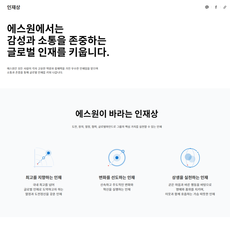 에스원은 ‘안심’이라는 가치를 기반으로 고객 중심, 혁신, 정도, 상생, 열정의 핵심 가치를 지향합니다. 인재상 또한 도전과 열정으로 끊임없이 혁신하는 인재, 고객을 최우선으로 생각하는 인재, 사회와 함께 성장하는 인재를 중요하게 생각하죠. 💡