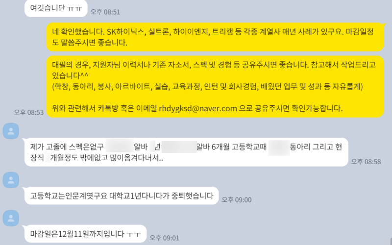 이번 지원자분은 SK트리켐 생산직에 지원하신 30대 초반의 남성분이셨습니다. 솔직히 말씀드리면, 처음 가져오신 자소서는 여러모로 아쉬운 점이 많았습니다. 문장 표현도 어색했고, 직무 관련 경험을 효과적으로 어필하지 못하고 계셨죠. 하지만, 숨겨진 잠재력이 충분히 보였기에, 저와 함께 며칠 밤낮으로 치열하게 고민하며 자소서를 완성해 나갔습니다. 거의 대필 수준으로 갈아엎었다고 해도 과언이 아니에요!